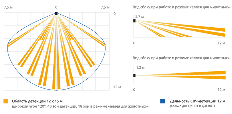 | Область детекции | 12 x 15 м, 120°, 40 зон детекции (18 зон в режиме «аллея для животных») | |